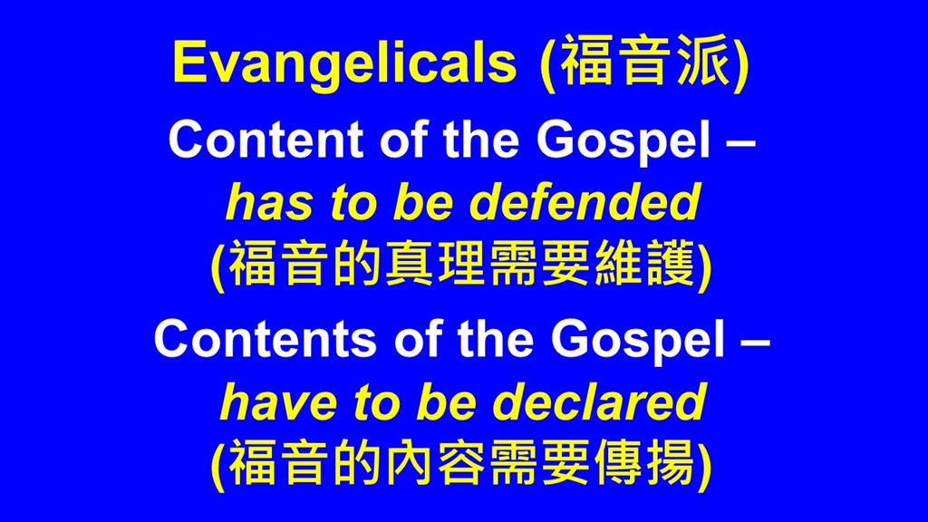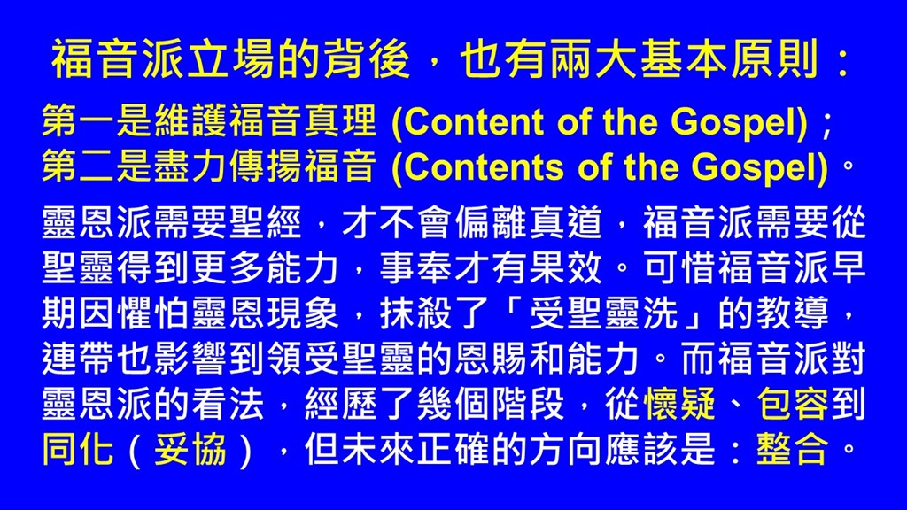 福音派立場的背後,也有兩大原則:第一是維護福音的基要真理,不容被扭曲或更改;第二是盡力傳揚福音。靈恩派很需要聖經,才不會偏離真道,而福音派很需要從聖靈得到更多的能力,事奉才會有果效。可惜福音派早期因為懼怕靈恩現象,而抹殺了「受聖靈洗」的教導,連帶也影響到領受聖靈的恩賜和能力。福音派對靈恩派的看法,經歷了幾個階段,從懷疑、包容到同化(妥協),但未來正確的方向應該是:整合。