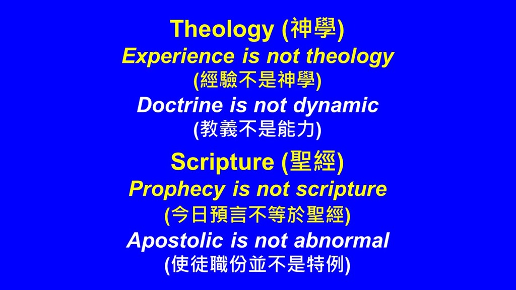今天的預言和聖經有兩大不同:第一、聖經是給世界各地每一個人的,但今天的預言只是給那些領受的人;第二、今天聲稱是預言的話,必須經過嚴謹的查驗,等他人來判斷和衡量,但聖經不需要查驗,聖經全部是出於神,但預言並非如此,有可能是出於人,有可能是出於撒但。靈恩派需要聖經,需要知道預言不等於聖經,他們需要忠於聖經。福音派則需要知道,神今天仍在說話,我們仍處在先知預言時代,神的子民都能發預言。