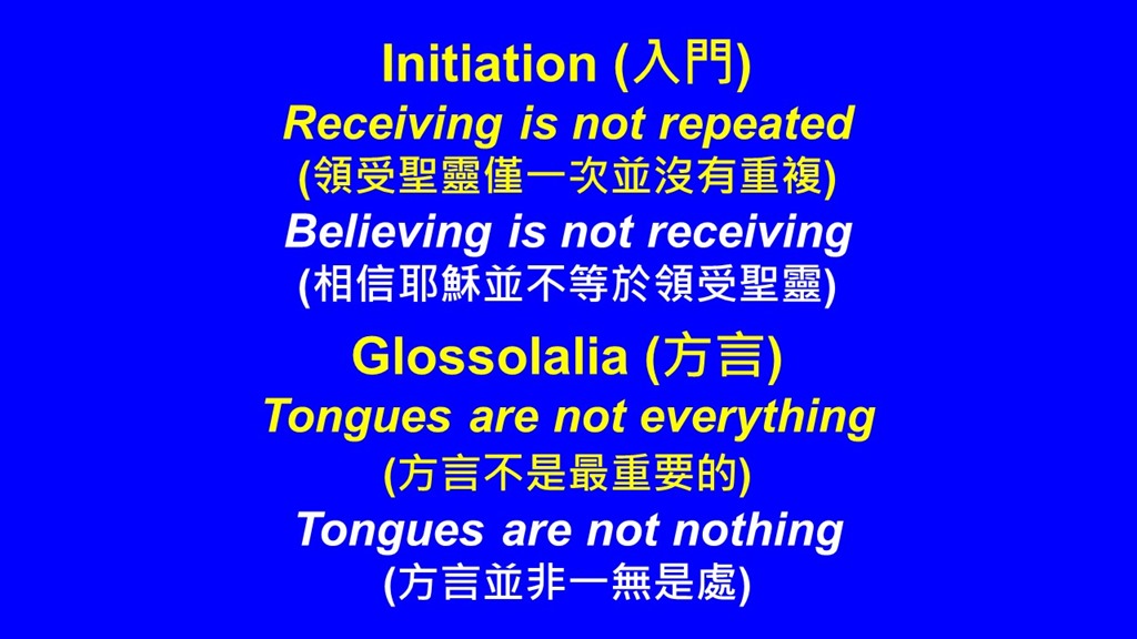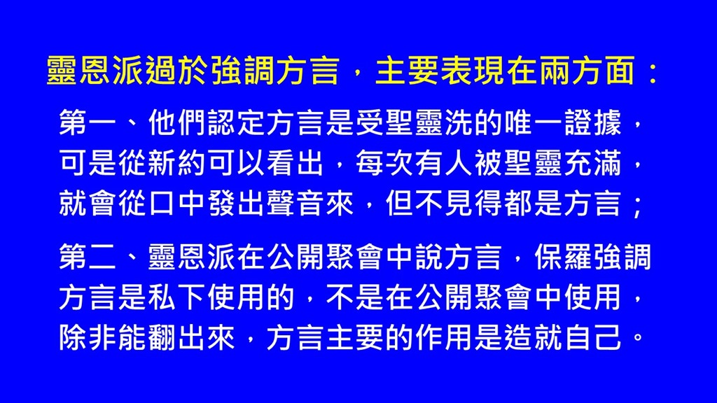 靈恩派過於強調方言,主要表現在兩方面:第一、他們認定方言是受聖靈洗的唯一證據,可是從新約聖經可以看出,每次有人被聖靈充滿,就會從口中發出聲音來,但不見得都是方言;第二、靈恩派會在公開聚會中說方言,但保羅強調方言是私底下使用的,不是在公開聚會中使用,除非能夠翻出來,因為方言主要的作用是造就自己。