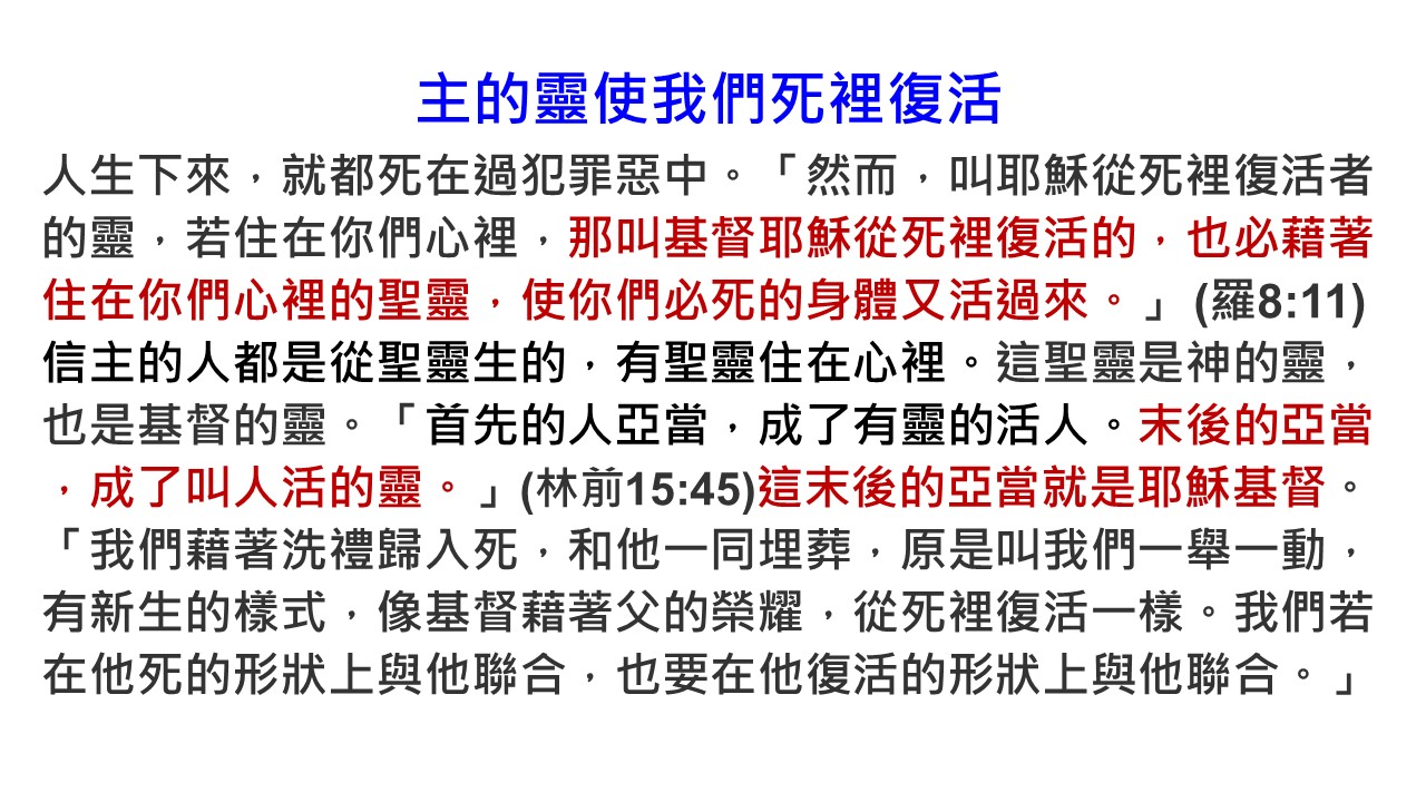 主耶穌說:「叫人活著的乃是靈,肉體是無益的。我對你們所說的話就是靈,就是生命。」(約6:63)