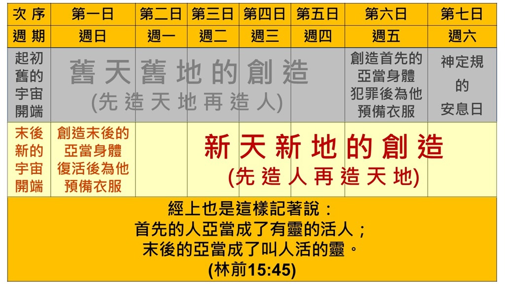 神起初工作六天創造世界,在第七天歇工,這第七天一歇就是幾千年。到了第八天,神又重新開工,開始全新的創造,而這全新創造的第一部分,就是耶穌復活之後的新身體。基督徒是在第八天(禮拜天)敬拜神,慶祝神重新開工,耶穌的復活,意義非常重大。