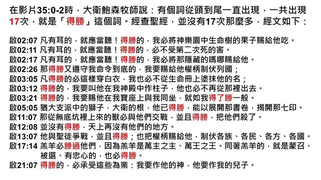 要看英文 NIV版本:启2:10 Victor’s Crown; 6:2 Conqueror, crown; 12:11 triumphed; 15:2 Victorious 总共17 个没错。